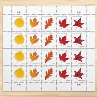 The Vibrant Leaves stamps are being issued as postcard stamps. Like a Forever® stamp, these stamps will always be