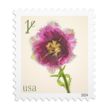 Add a delicate touch to your mail with the Fringed Tulip stamp from the U.S. Postal ServiceR.The stamp features 1 purple flower and its frayed petal edges on a yellow-toned cream background. To create the image,photographer Harold Davis backlit the flower on a light box and combined multiple photogr